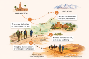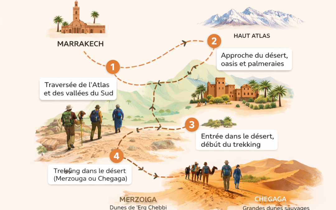 • Trekking désert marocain depuis Marrakech : itinéraire vers Merzouga et Chegaga